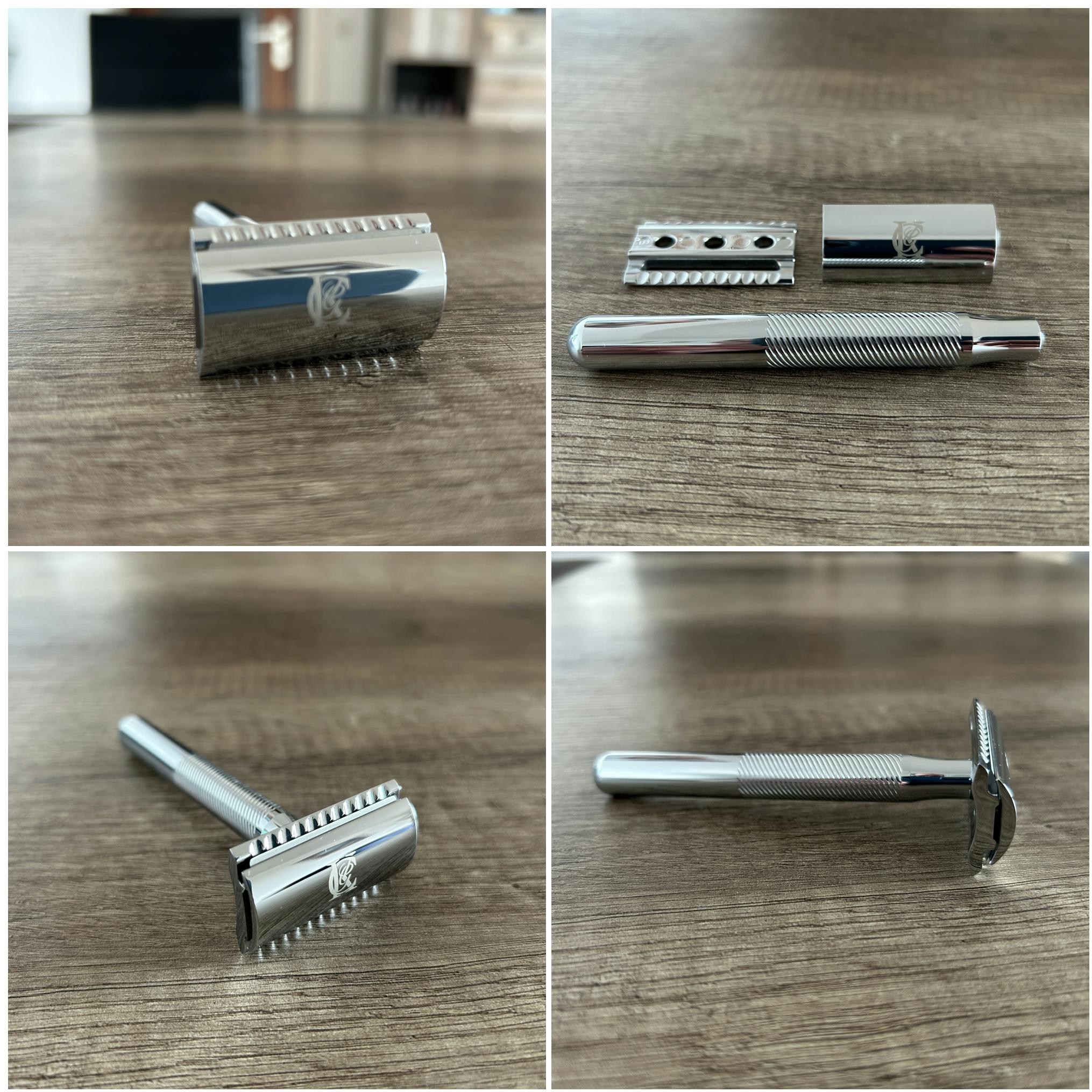 Es iss ein klassischer Rasierhobel, man schraubt den Kopf ab, legt die Klinge ein, schraubt ihn wieder zusammen, fertig. Es gibt nichts zum Einstellen oder irgendwas in der Art. Also ganz einfach, so mag ich das. Was ich nicht mag, vielleicht sieht man im Bild, oben Links, sobald die Klinge eingelegt ist bekommt er „Flügel“, will heißen das die Klinge seitlich am Kopf hervorragt und das nicht zu knapp. Also, beim rasieren unter der Nase sollte man echt aufpassen sonst könnte es zu unschönen Szenen im Badezimmer kommen. Leider ist das bei vielen anderen Herstellern auch so, ich weiß nicht warum die Köpfe der Rasierhobel nicht einfach etwas breiter macht. Obwohl der der King C. Gillette überwiegend poliert daher kommt hat man durch die Rillen in der oberen Hälfte des Griffs einen ziemlich guten Gripp. Rutschen tut da nichts. Der Griff selbst ist für meinen Geschmack ein wenig zu lang aber dass ist schon ok.